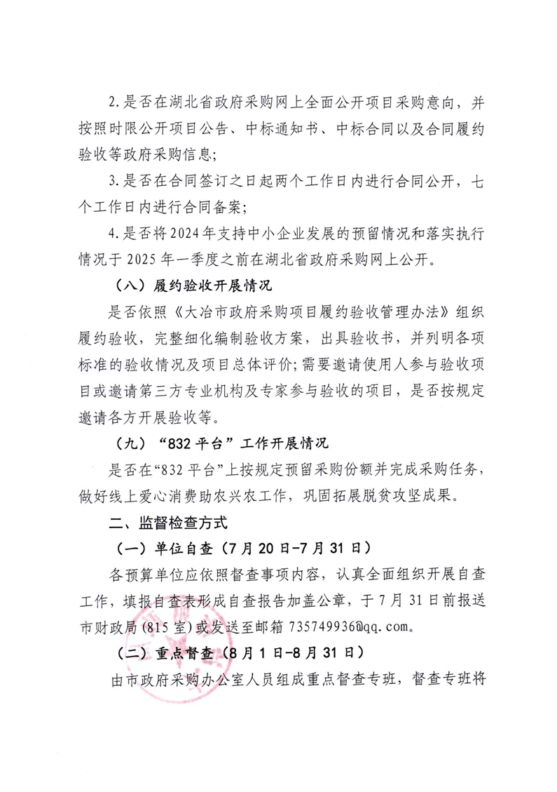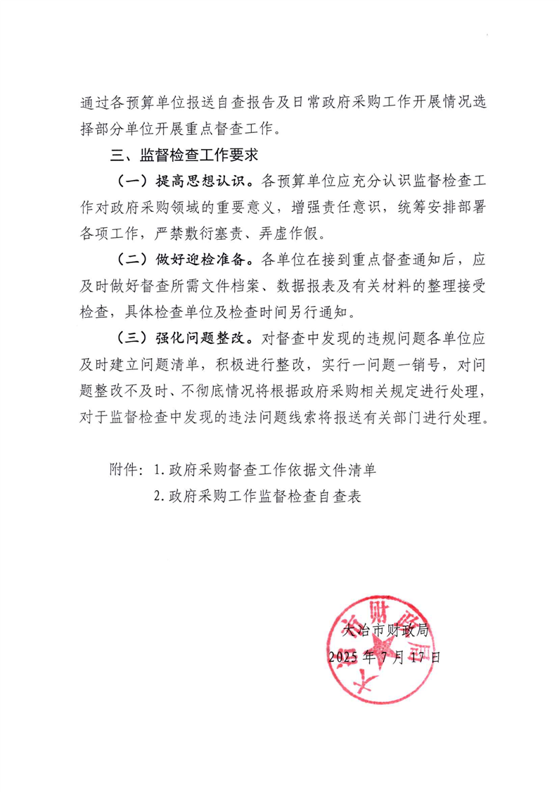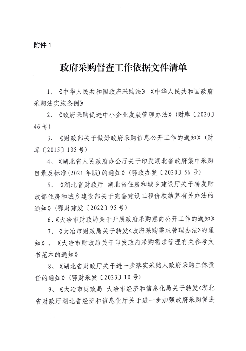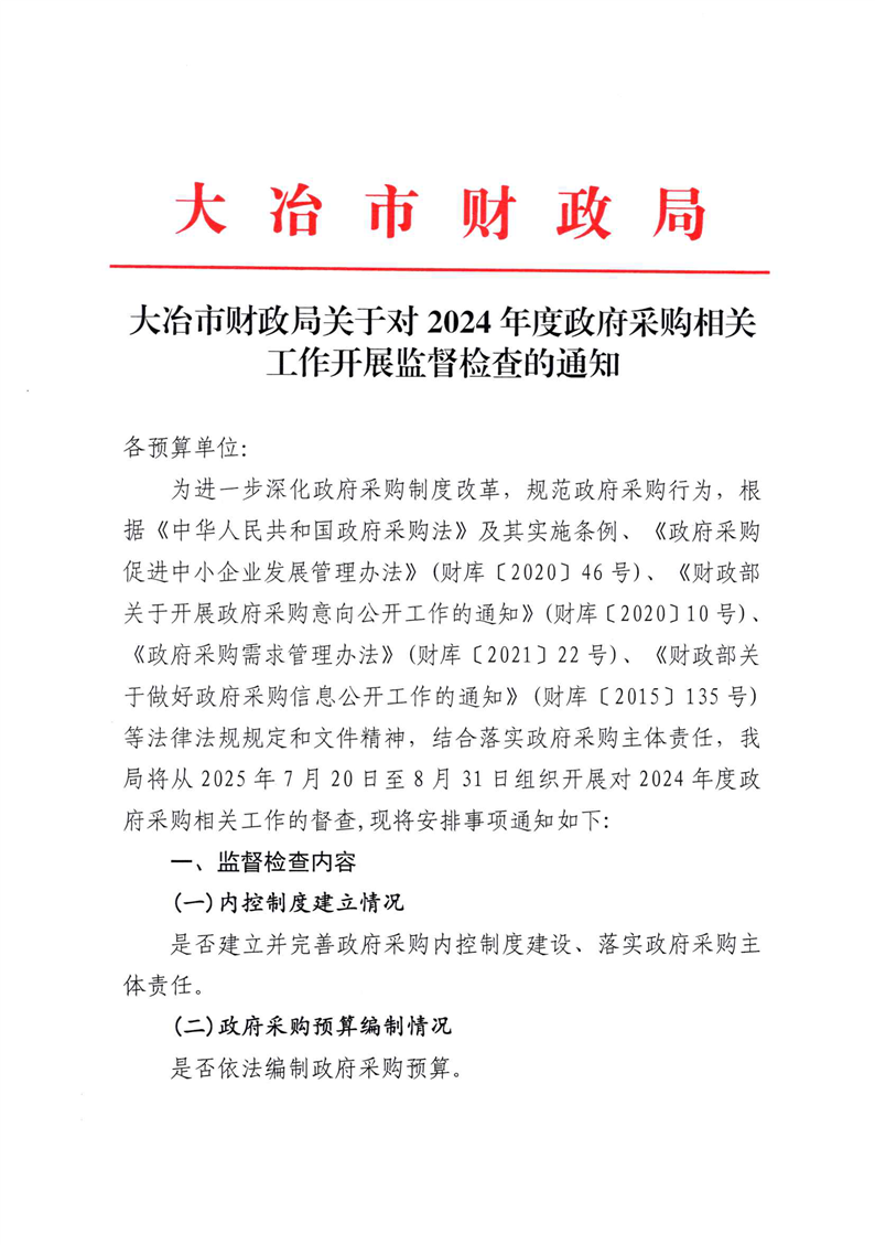 大冶市财政局关于对2024年度政府采购项目工作开展监督检查的通知